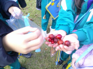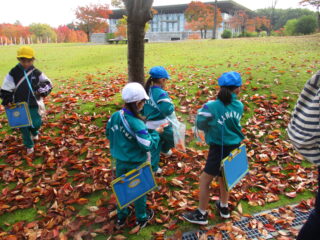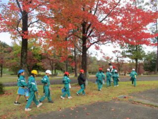 出発‼金山探検隊~秋みつけ編~ ー1・2年生ー 投稿日時: 2025年11月5日 投稿者: さわらび 11月5日(水)に金山探検隊(1・2年生と年長さん)で太閤山ランドへ秋みつけに行きました。 「みんなで仲よく、楽しく、安全に秋みつけをしよう」を合言葉に、どんぐりやもみじ、山茱萸(サンシュユ)の実等いろいろな秋の植物をみつけることができました。 「帽子付きのどんぐりをみつけられてうれしかった」「顔よりも大きな葉っぱが落ちていてびっくりした」などうれしそうに話していました。 金山探検隊の探検は続く…