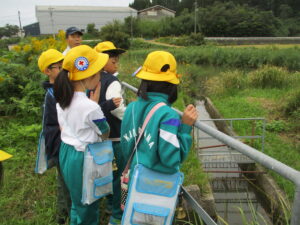 立神池(溜め池)見学に行ってきました。4年生 投稿日時: 2025年10月24日 投稿者: さわらび 10月22日(水)に地域の溜め池に見学に行ってきました。 溜め池の先生に同行していただき、 学校から立神池まで歩きながら 説明を聞きました。 里山地区である金山小学校区にとって、溜め池は、 農業や冬の消雪等に使われ大切な池であることが分かりました。