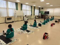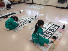 毛筆での書初に初挑戦! ー3年生ー 投稿日時: 2025年12月4日 投稿者: さわらび 3年生から毛筆の学習が始まり、筆で書くことには少しずつ慣れてきた子供たちでしたが、今回挑戦するのはだるま筆での書初です。 その他にも、紙の大きさや床の上で書くことなど、いつもの毛筆とは違うことがたくさんあります。 初めてのことに戸惑いつつも、姿勢や筆の運び方に気を付けながら、集中して書くことができました。
