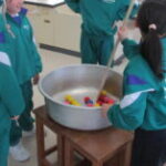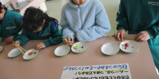 体験コーナーでは、調理員さんが給食を作るときに使う大きなしゃもじでかき混ぜる体験や箸で小さい物をつまむ体験がありました。