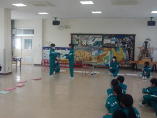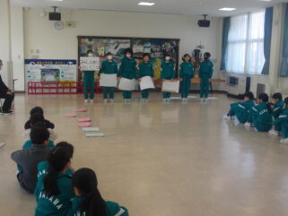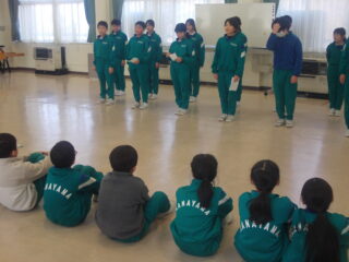 3月9日(月)の5限目、4・5・6年生が多目的教室に集まり、「学校のリーダー引継式」を行いました。