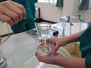 ものを燃やすはたらきのある気体は・・・?ー6年生ー 投稿日時: 2026年4月30日 投稿者: さわらび 最近の理科の学習の様子です。 空気は、3/4が窒素であり、1/5が酸素であると分かった6年生。ものを燃やすはたらきのある気体は、どれなのか考え、この日は実験で調べました。 水上置換で、ビーカーの中に窒素や酸素、二酸化炭素を入れて、火のついたろうそくを入れました。 子供たちは、真剣なまなざしでその様子を観察しました。 窒素や二酸化炭素の入ったビーカーに入れると、一瞬で火が消えたことに驚いていました。